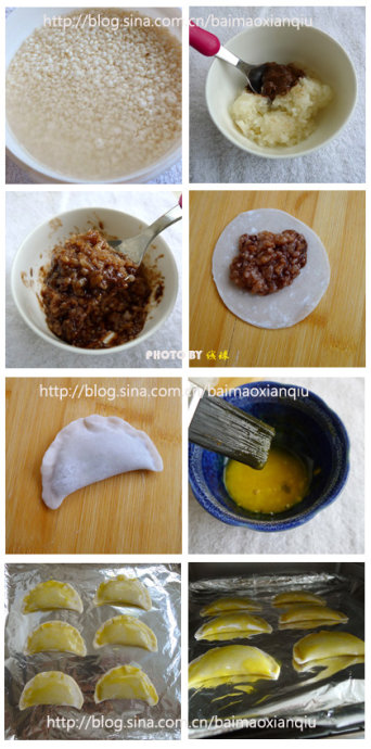 原料:麵粉200克,開水100克,肉餡150克,熟蛋黃4個製作方法:麵粉加入開水燙成麵團,揉光搓條下劑子,擀成圓皮